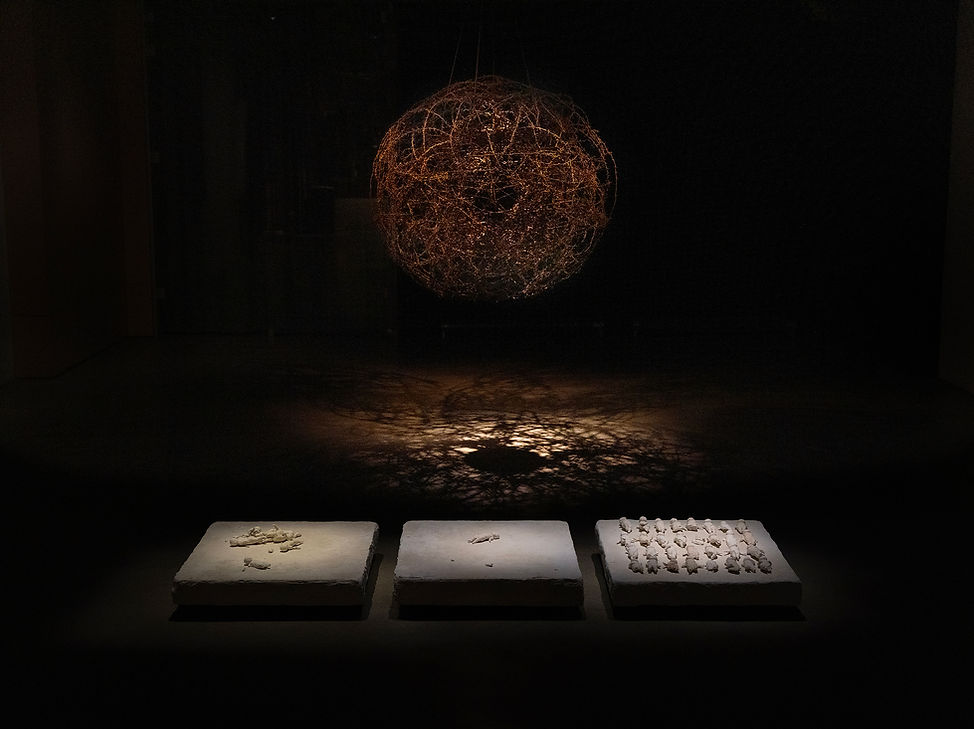 I det andre glassmonteret ser vi fire reagensglass, fylt med henholdsvis tårer og salt, piggtråd og jern. -Tårer transformert til salt,- piggtråd transformert tilbake til jorden, til jern.